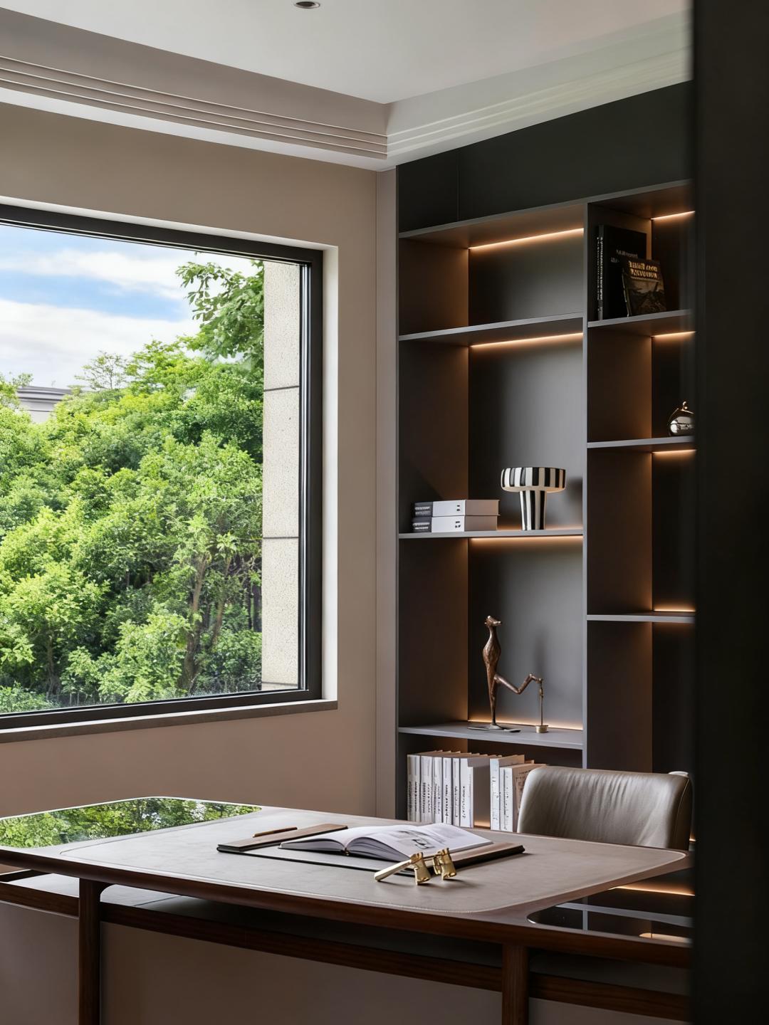 灰藍的門窗能為書房帶來寧靜深邃的氛圍,如同廣闊的天空與深邃的海洋,讓人在知識的海洋中遨游時,內(nèi)心保持平靜與專注。